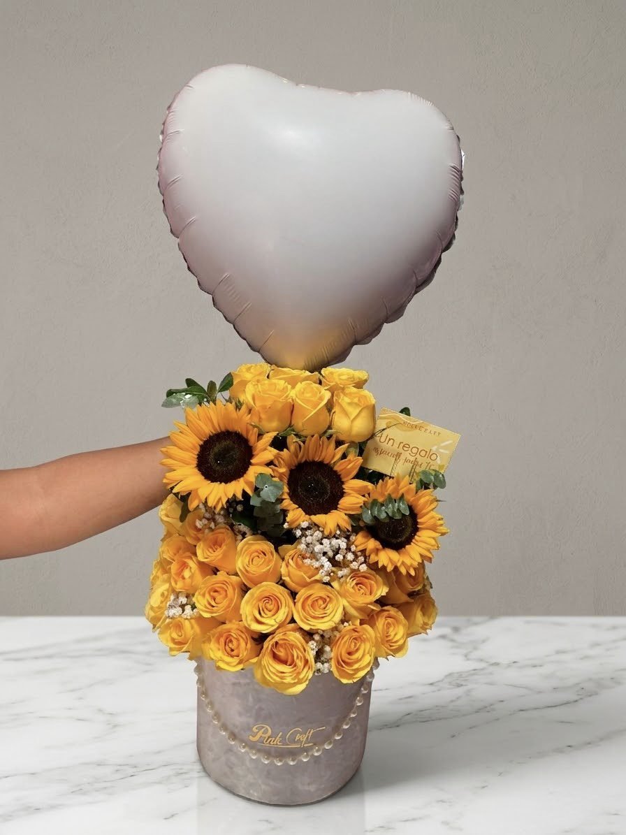 Caja de rosas con girasoles