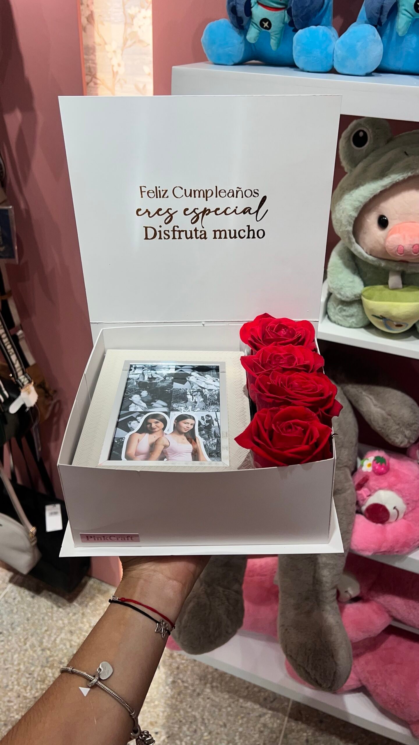 Caja con flores, dulces y taza de café